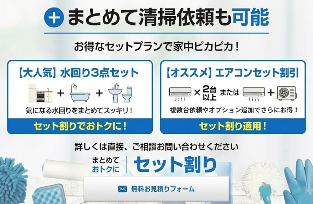 市販の洗剤では落ちない汚れも、業務用洗剤と専門技術で徹底除去。エアコン・水回り・油汚れなど、プロならではの仕上がりを提供。